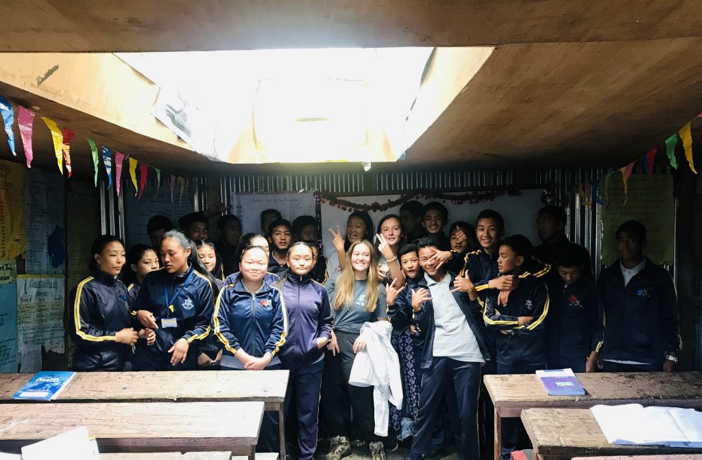 It was five in the morning, a whole two hours before breakfast, and some of us girls were already awake, washing our laundry by hand. After getting a head-start on the day, we then enjoyed some hot drinks—salt tea/Sherpa tea (my personal favorite), milk tea, coffee, hot cocoa—and played the card game Gin. Other students began to wake up and roll in to the breakfast area. We ate rice pudding/porridge with apples and pomegranate seeds, buckwheat pancakes, and egg omelettes. Our group then split into two with one half headed to the project site and the other going to the school. At the work site, a few of us helped workers carry cement for the foundation posts and other students filled the edges of the foundation with dirt and mud by shoveling and passing along bowls. We were lucky enough to meet Karma, one of the founders of The Small World. We’re glad to have him for these last few days in Salleri and at the project site.
